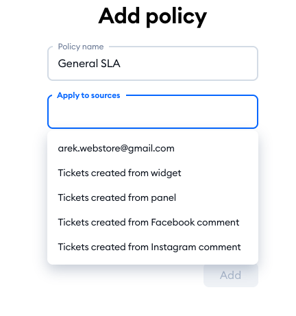 If your Tidio project is integrated with several external mailboxes, you can set different policies for each mailbox. On top of that, you can add different policies for tickets that are submitted by website visitors directly via your chat widget, and even for tickets that agents create themselves (from incoming chats, or from scratch) within the Tidio panel.