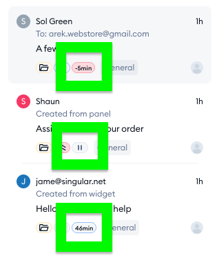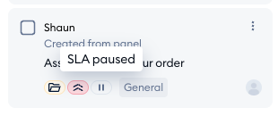 A grey tag (with the pause symbol) indicates that the SLA is currently paused; this means it's a new ticket created by an agent directly, or the agent replied to an incoming ticket and is awaiting the customer's response.