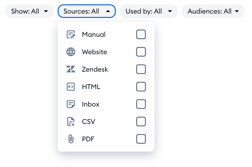 The first option on the left allows you to display either all the data sources at once, or just the folders, or just the particular Q&As (question-and-answer pairs). Note that the folders option simply shows any websites (and Zendesk help centers) you've added, while the Q&A option will let you see everything - including the particular Q&As that are found inside the website (and Zendesk) folders.