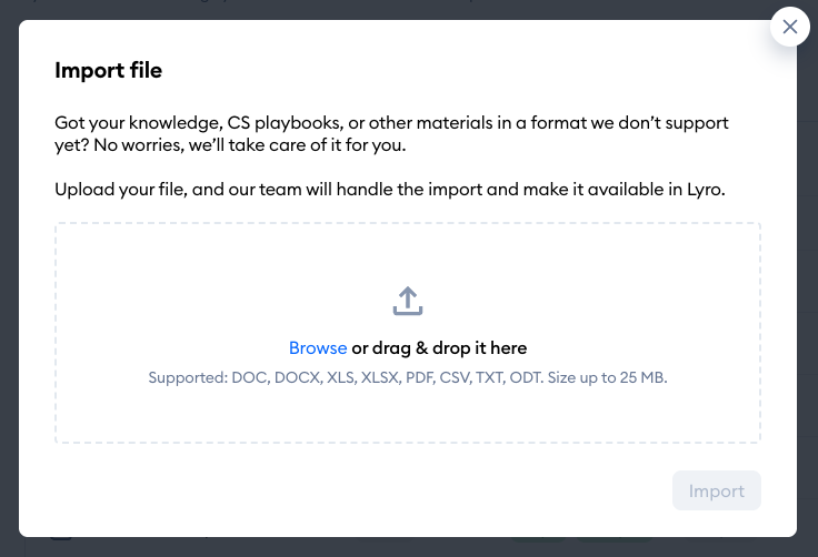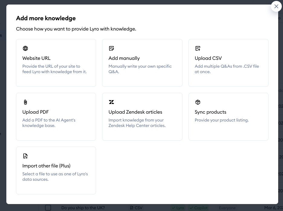 It is possible to expand Lyro's data source by importing a CSV or a PDF file into Tidio. There is also the option to upload other types of files, but that is reserved for Plus subscribers.