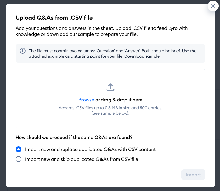 When you use that option, you can also download a sample CSV file that shows you the proper formatting. You also get two options for if a Q&A is duplicated by your import: to either replace the old version of the Q&A or to skip the duplicate (keeping the old version).