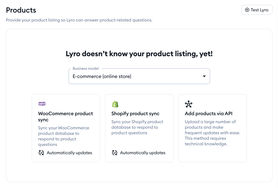 Inside your project's Lyro AI Agent section, go to the Knowledge > Products tab to see the available options. What you're interested in this case is the Shopify product sync option, in the middle: