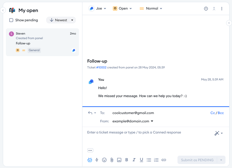 Now that you've connected your chosen mailbox (or several), Ticketing is up and running - and you can start receiving tickets, creating new ones from scratch, and responding to incoming emails.