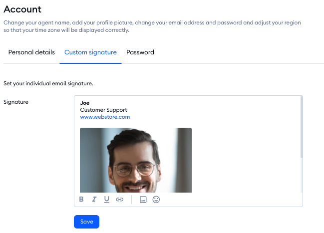 Each agent can add their own signature in the Custom signature tab, inside Settings > Account. You can add text with basic formatting options (including hyperlinks) as well as images (when adding multiple images, they can only be placed vertically).