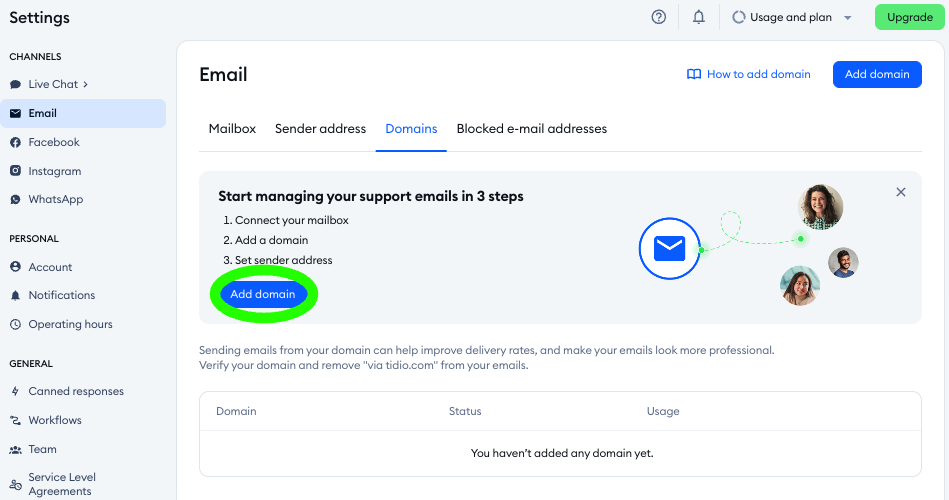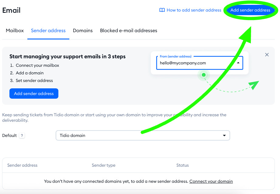 The best available way is to connect your own domain with your Tidio project, and use that as the basis of your sender address. By default, the domain connection is done automatically through an app called Entri; but manual connection is possible as well (especially if your domain provider is unable to work with Entri). We'll only cover the automatic method here.