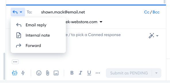 When viewing a ticket, you can respond to it directly, leave internal notes for your team, or forward the ticket to another recipient (or recipients). Naturally, you can also select the sender address that you wish to use when responding to this ticket. You can see these different options inside each ticket; you can also use the additional Cc and Bcc options if you need to add more recipients.