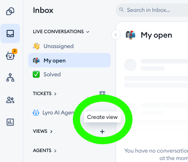 To create your custom view, click on the Create view button in your Inbox section; it's located under the Tickets inbox, right next to the Views list: