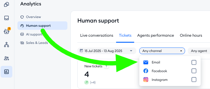 This data is part of your general ticket analytics, so it can be found in the Analytics > Tickets section. Once inside, open the channels drop-down menu, and select the channel(s) you'd like to check out: