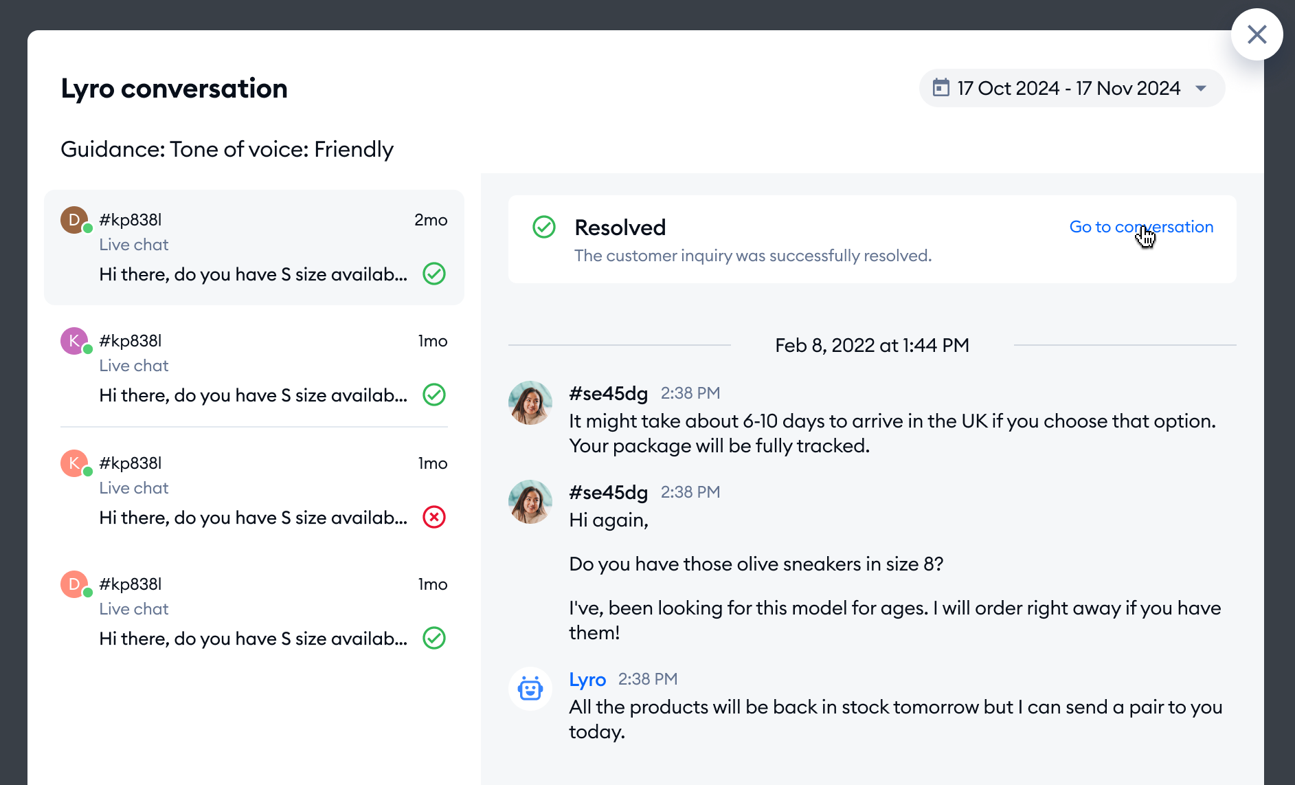 Once you click on it, you will see a window pop up. It will list all the conversations where these specific instructions have been used, so that you can review Lyro's performance in that regard. You can also use the calendar option in the top-right to select a specific timeframe that you're interested in.