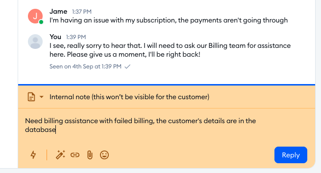 When typing in the internal note mode, the text input area will change color. You can type your note and be sure that the customer will not see it - the note is intended only for you and your team.