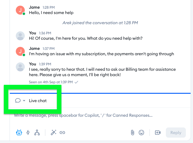 To add an internal note inside a live conversation, click on the Live chat button in the top-left of your text input area: