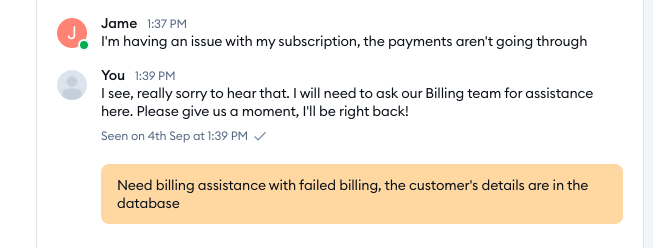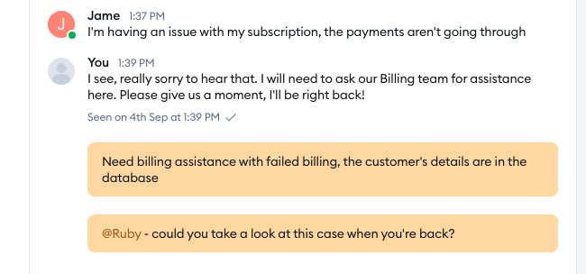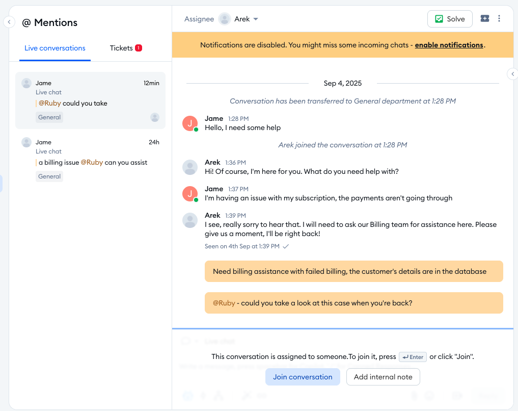 Apart from leaving relevant internal information inside the chat (or ticket), internal notes have one more practical feature: the ability to mention agents directly. This is especially useful if you do not want to assign the chat (or ticket) to another team member - and you only need the other agent to be notified of the note, e.g. when you need their assistance with something.