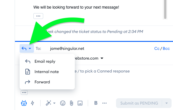 The same Internal note option is available if you're responding to a ticket instead of a live chat. Find it in the top-left of your text input area as well, after clicking the icon there: