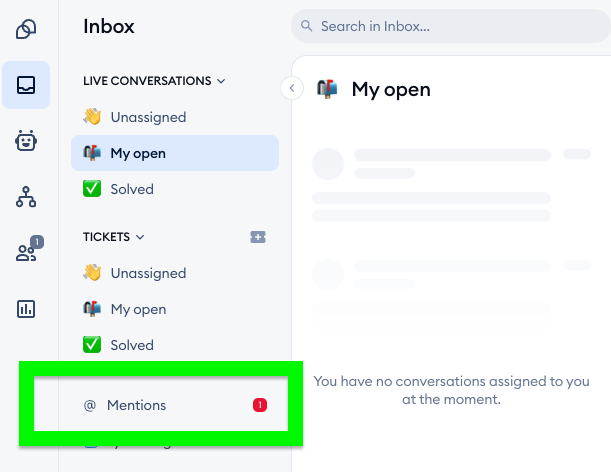 If an agent is mentioned inside a chat or ticket, they will see a notification about that in their own Inbox section in Tidio. All such notifications will appear in the Mentions folder: