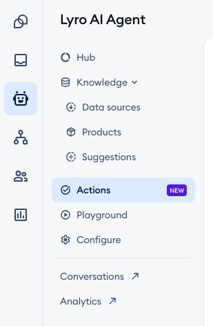 To access your available Action templates, open the Lyro AI Agent section, and head over to Actions: