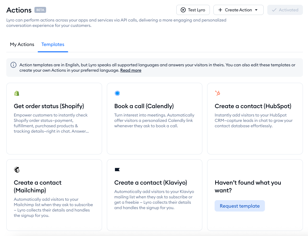 Lyro Actions are a powerful tool that allow Lyro to connect with external systems and communicate back and forth, making use of API. There are a number of templates available, letting you quickly set up specific integrations with 3rd-party apps (e.g. Calendly, Shopify, or Mailchimp, among others).