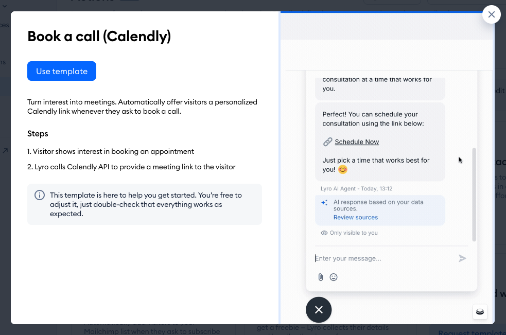 With this template, Lyro connects with Calendly API and is able to provide your chat visitor with the appropriate link - so they can schedule an appointment with you.