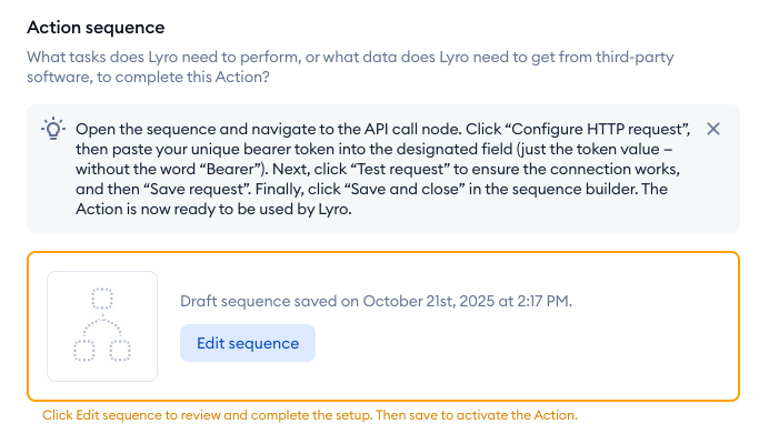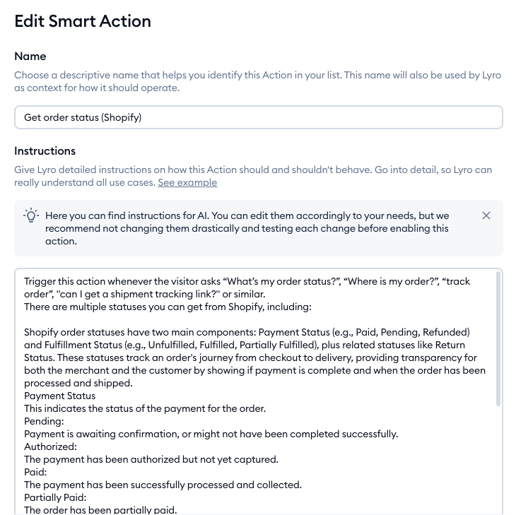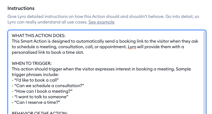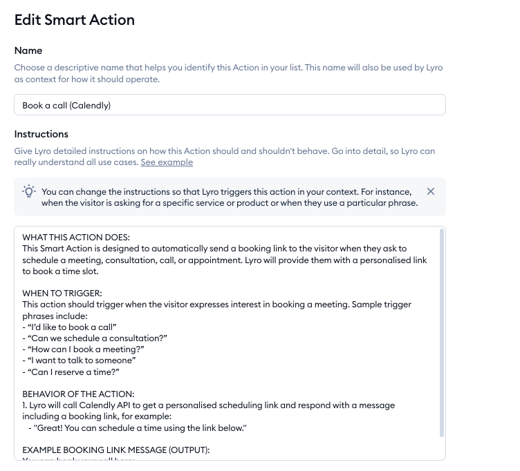 Most importantly, take a look at the instructions field. That is the prompt that Lyro will use to trigger the Action during a chat, and how to behave in detail. Make sure to customize these instructions to suit your needs, and be as detailed as you can - especially regarding when to trigger the action: