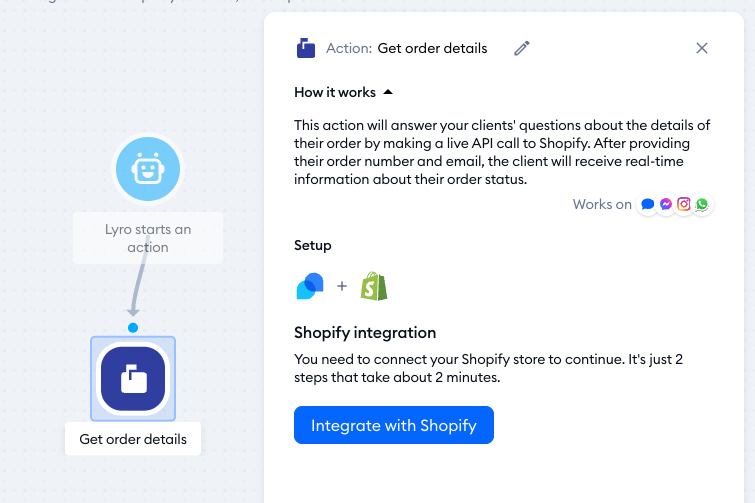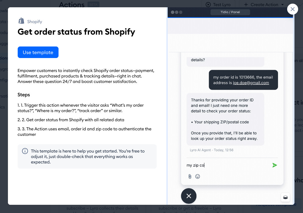 With this template, Lyro connects with your Shopify store's API and is able to provide your customer with details regarding their order, including the URL for tracking their package. For this to work, your Tidio project needs to be integrated with your Shopify store (although you will get the option to integrate directly from this template, as part of its setup, if necessary).