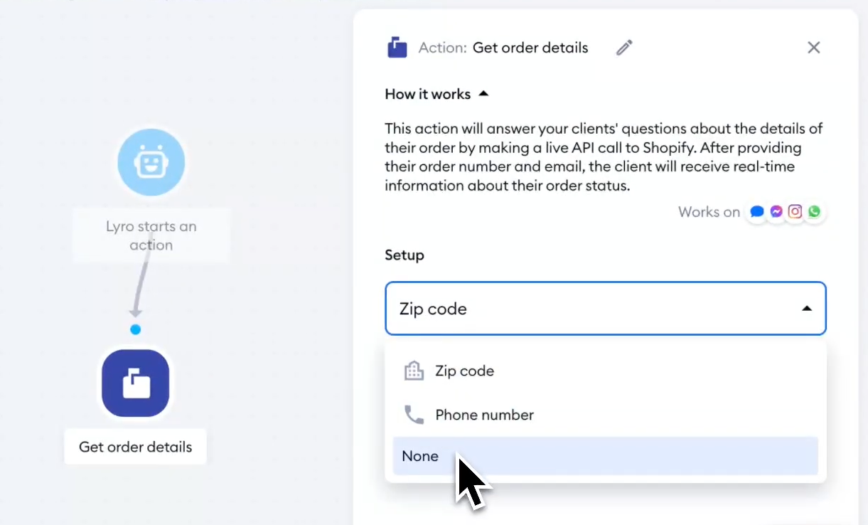 You can decide whether Lyro asks for the customer's zip code (the default), their phone number, or nothing. Note that the customer is always asked for their email and order ID, regardless of this setting.