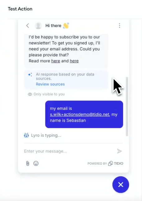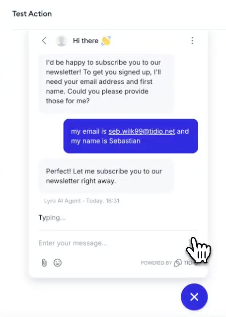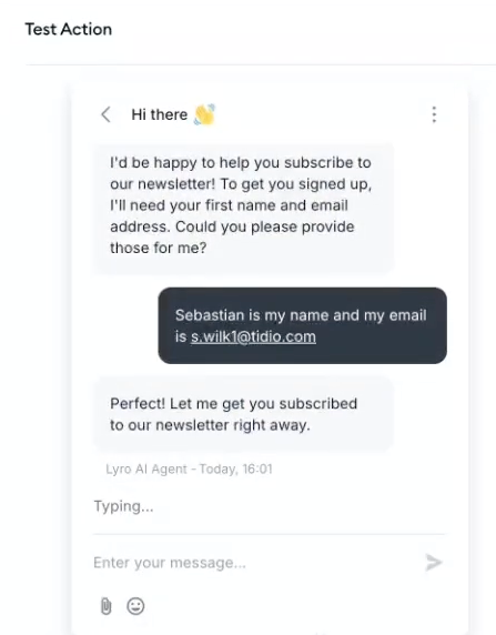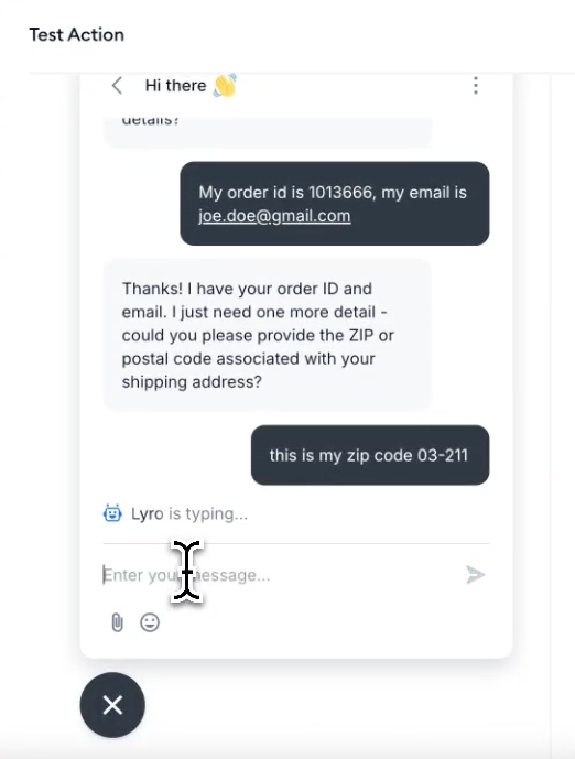 Finally, you can test your new Action by clicking the Test Action button at the bottom of the Action editor. This lets you chat with Lyro and test out its new Action in a controlled environment: