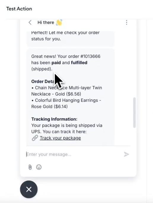 Note how Lyro lays out the available information (order details, tracking link, etc.). If you do not like the way some information is presented, you may want to go back to the Instructions section and modify the prompt to your preference, and test again.