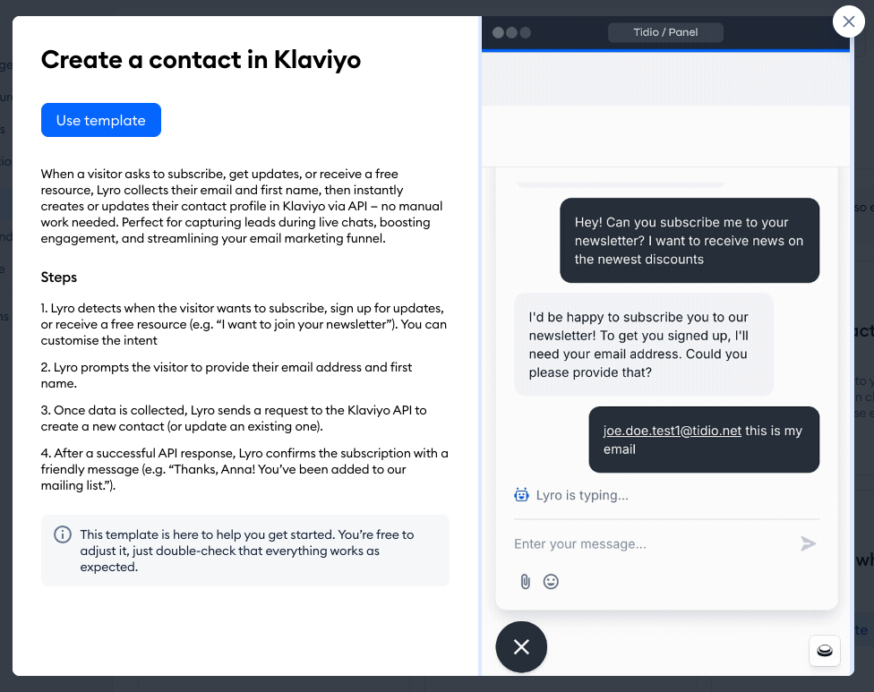 With this template, Lyro connects with Klaviyo API and is able to save your visitor's details as a contact in Klaviyo. Lyro can ask for the necessary information (e.g. name and email) when the visitor wants to subscribe, or if they express their willingness in some other way.