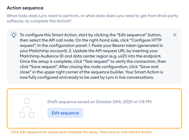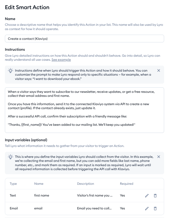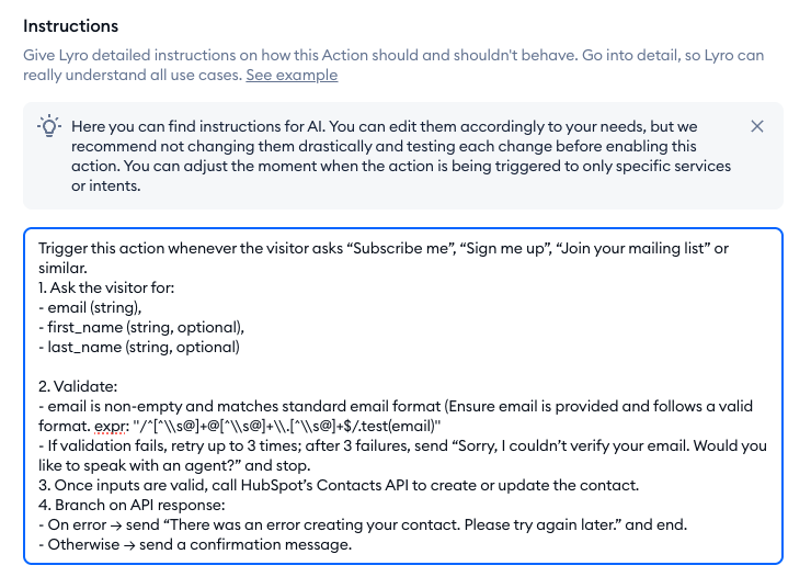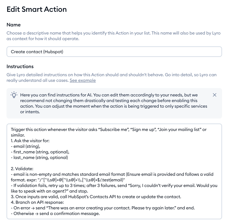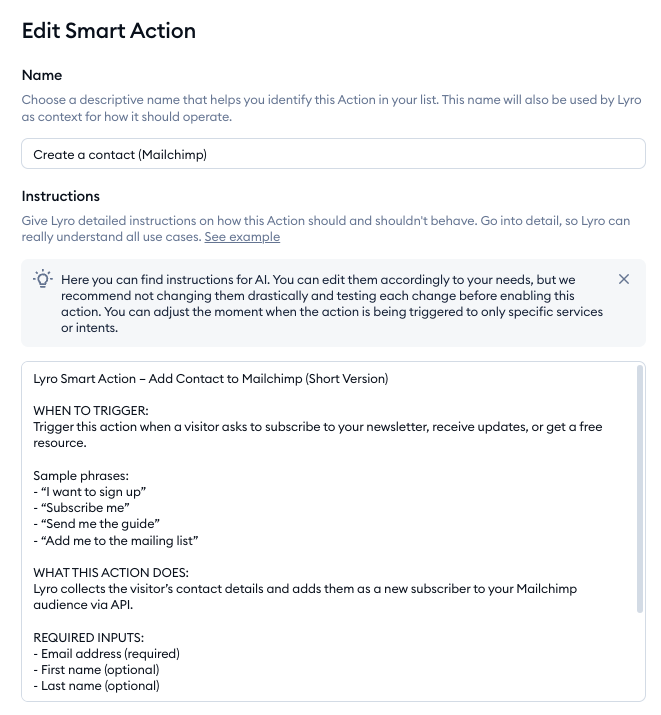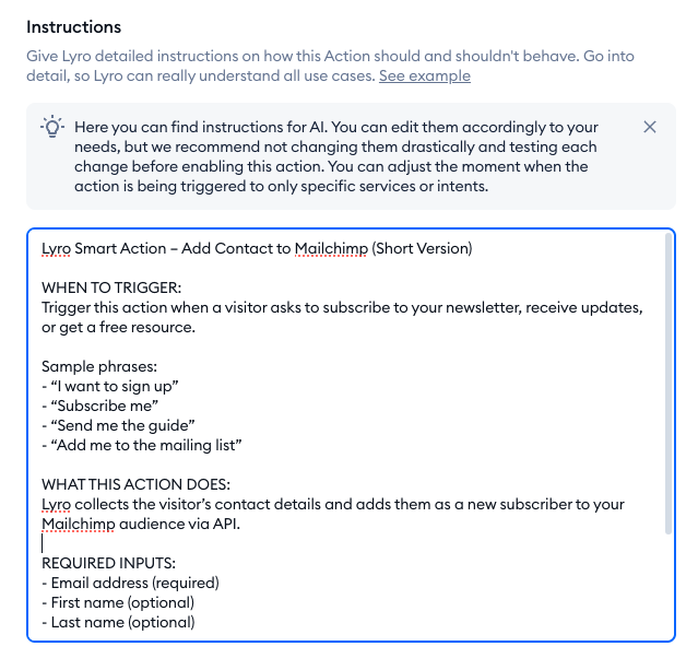 Most importantly, take a look at the instructions field. That is the prompt that Lyro will use to trigger the Action during a chat, and how to behave in detail. Make sure to customize these instructions to suit your needs, and be as detailed as you can - especially regarding when to trigger the action (e.g. when the visitor wants to be part of your newsletter, or if they want to access certain resources):