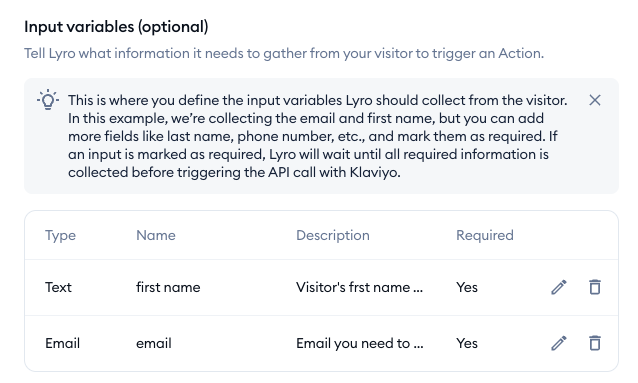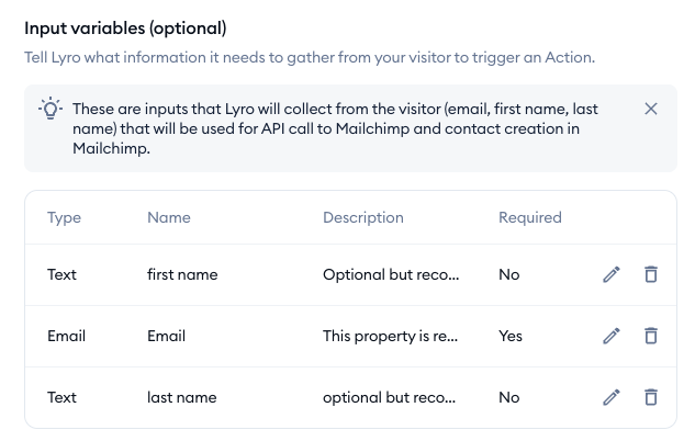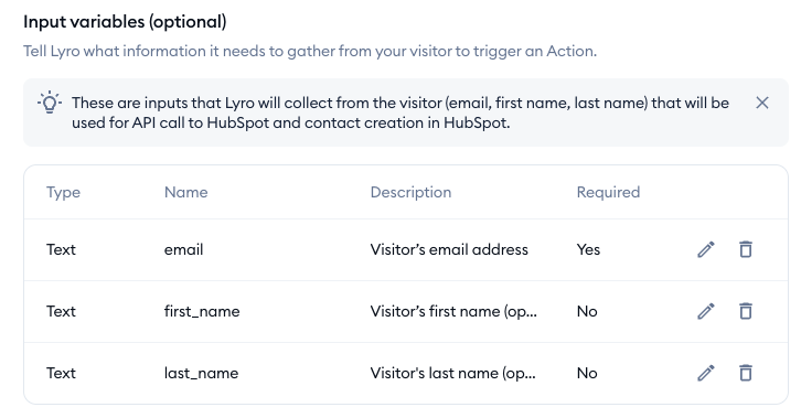 Underneath the instructions, you will notice the Input variables section. It lists the data that Lyro is required to collect from your visitor before a contact can be created. If you wish, you can modify the listed variables, remove some, or add new variables: