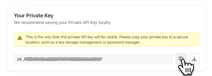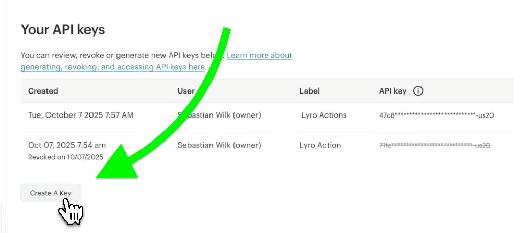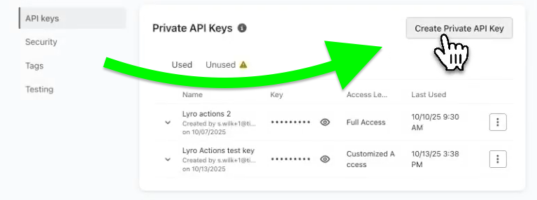 Inside, click on the Create Private API Key button on the right in order to create a new key for your Lyro Action:
