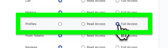 In the column on the right, find the access options for Profiles, and select Full Access. This is required for Lyro to be able to get information from Klaviyo as well as create new contacts; we recommend you do not change any other options, however.
