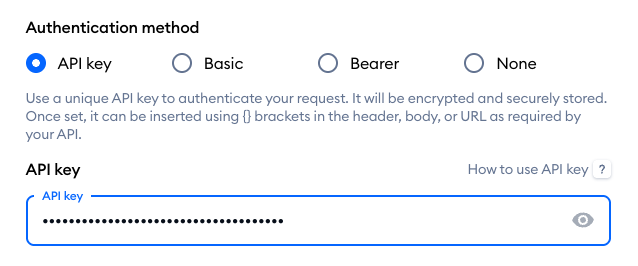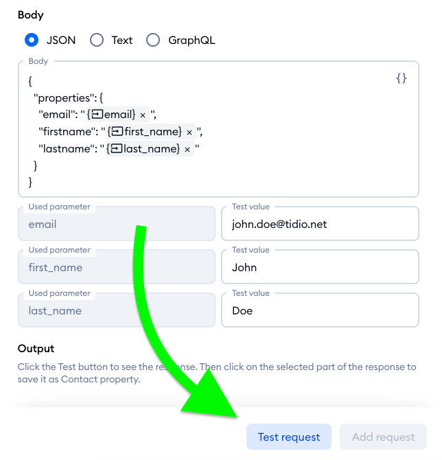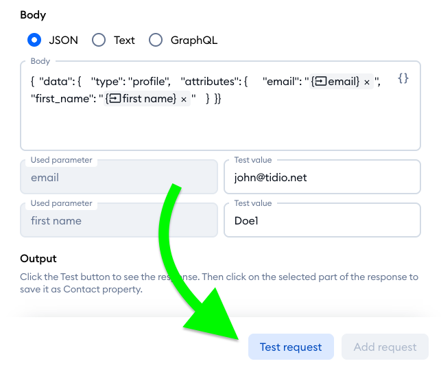 Back in your Tidio project's request editor, paste the API key you've just copied into the API key field:
