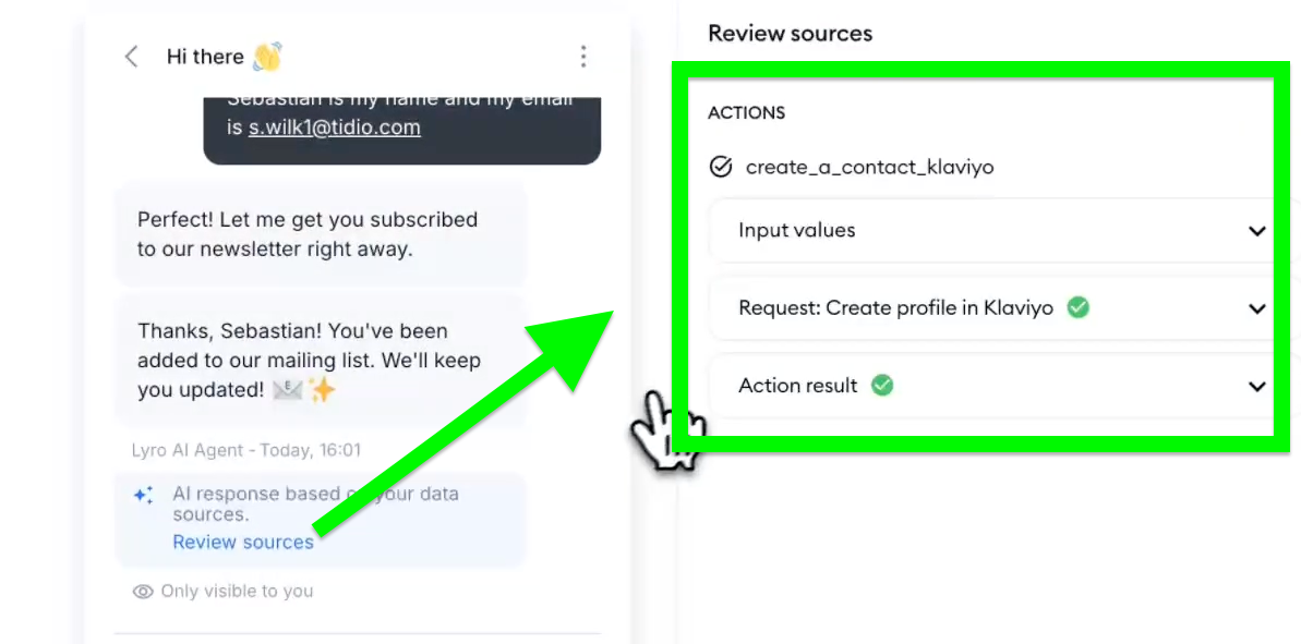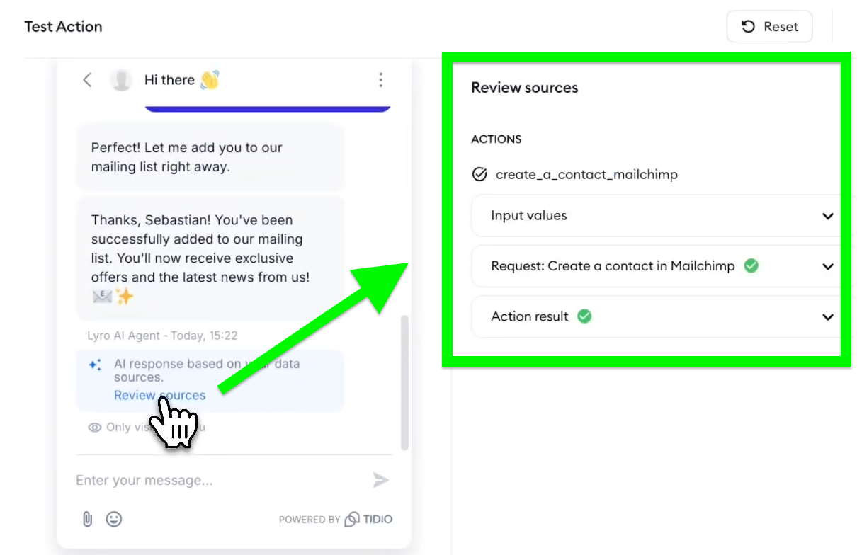 Note that you can click on the Review sources link underneath Lyro's response, and you will see all the associated input values, the request, and the end result. This lets you verify that everything has worked correctly in this particular interaction: