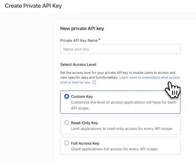 Name your new API key, and select the Custom Key option underneath: