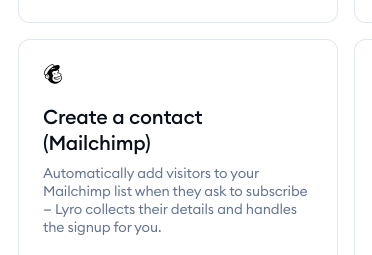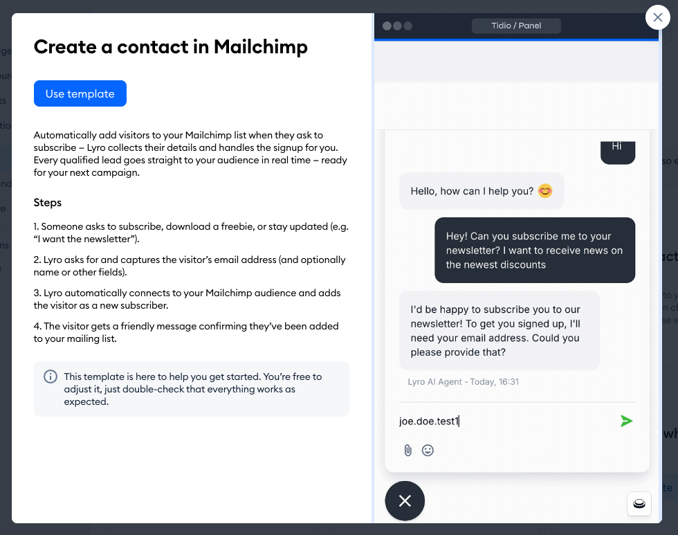 With this template, Lyro connects with Mailchimp API and is able to save your visitor's details as a contact in Mailchimp. Lyro can ask for the necessary information (e.g. name and email) when the visitor wants to subscribe, or if they express their willingness in some other way.