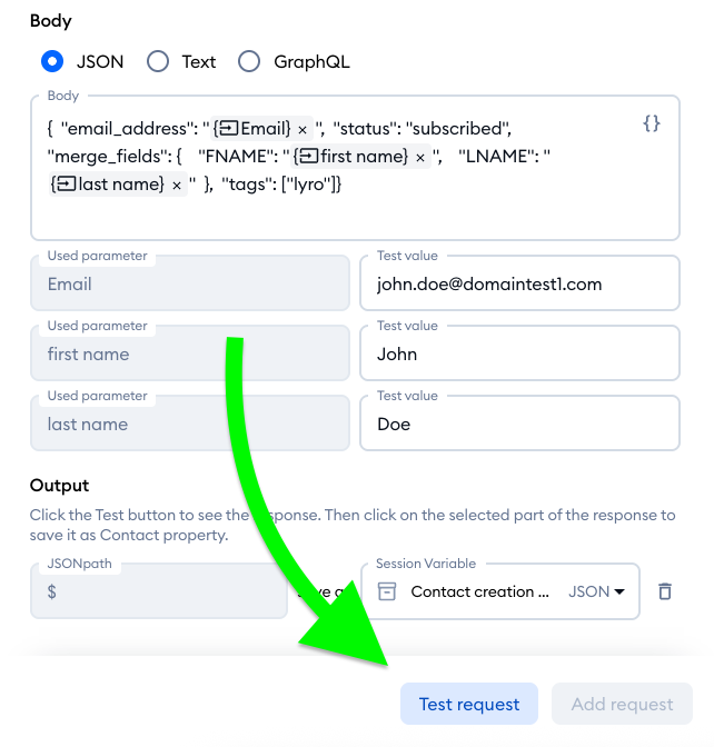 Now that the key is in place, you should use the Test request option at the bottom of the editor, which will use the test values that you can see (and modify) above it, for testing purposes:
