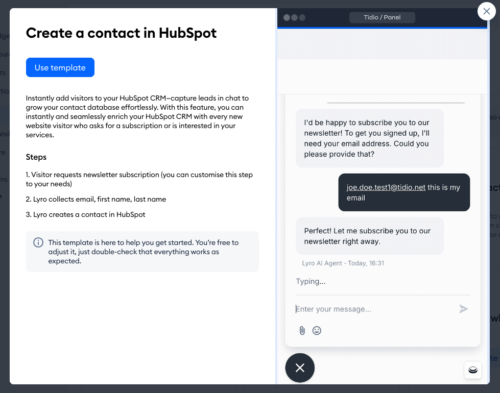 With this template, Lyro connects with HubSpot API and is able to save your visitor's details as a contact in HubSpot. Lyro can ask for the necessary information (e.g. name and email) when the visitor wants to subscribe, or if they express their willingness in some other way.