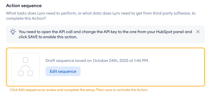 Once inside the editor, you will notice that the API call node requires your attention. Click on it, and you will notice that the request hasn't been completed yet. The request is what connects Lyro with the external system (HubSpot, in this case) and allows the exchange of data.