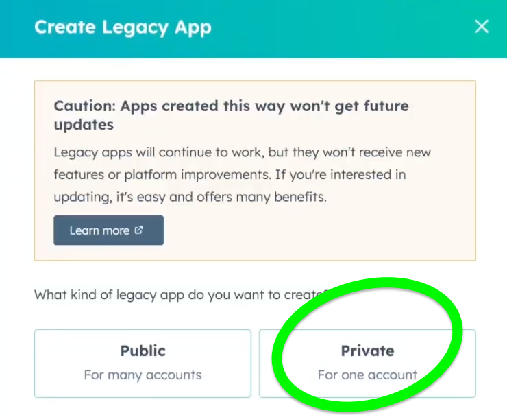 Select the Private option for your new legacy app: