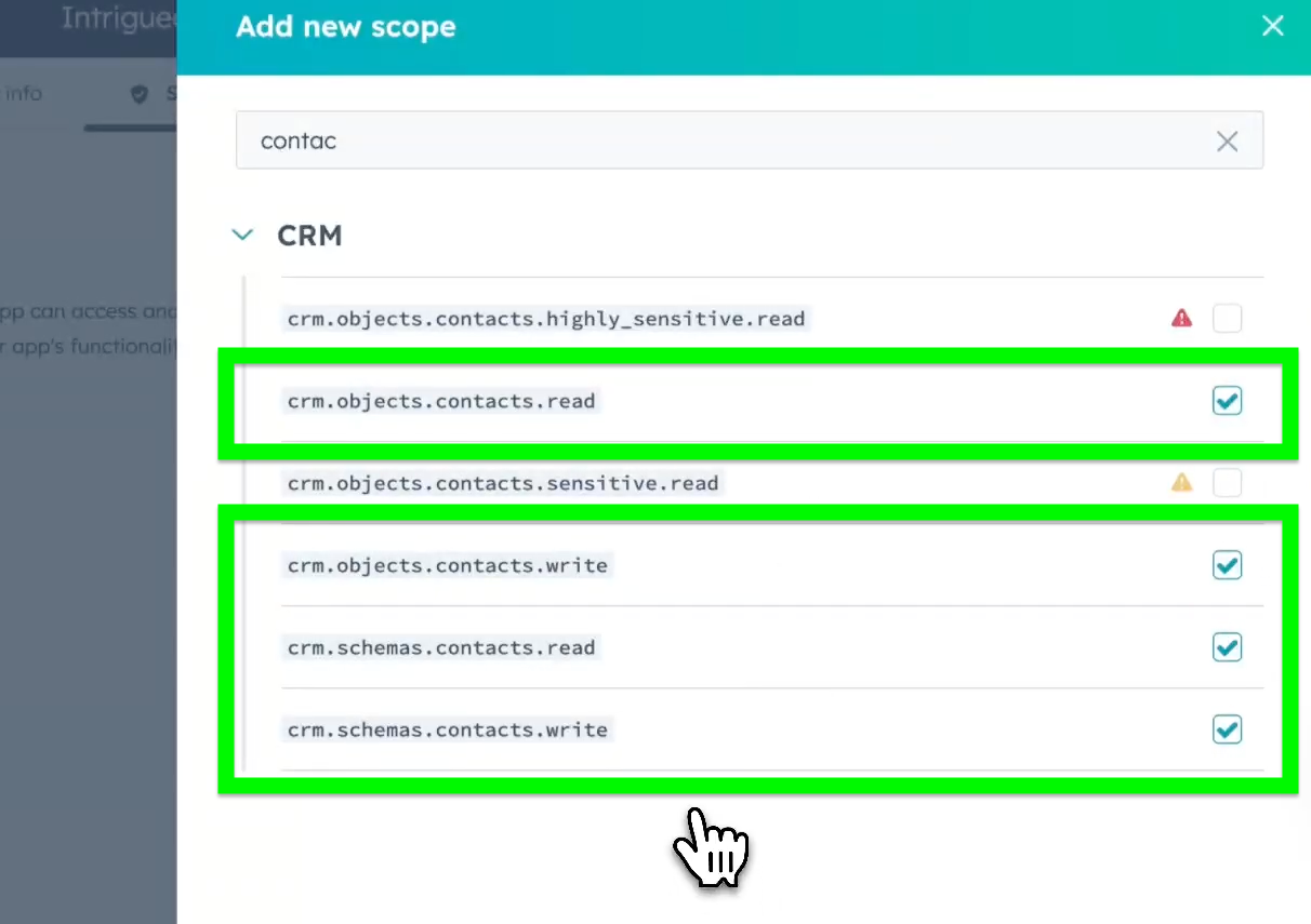 In the panel that appears, search for scopes that include the word 'contact', and select the four scopes as shown in the screenshot below: