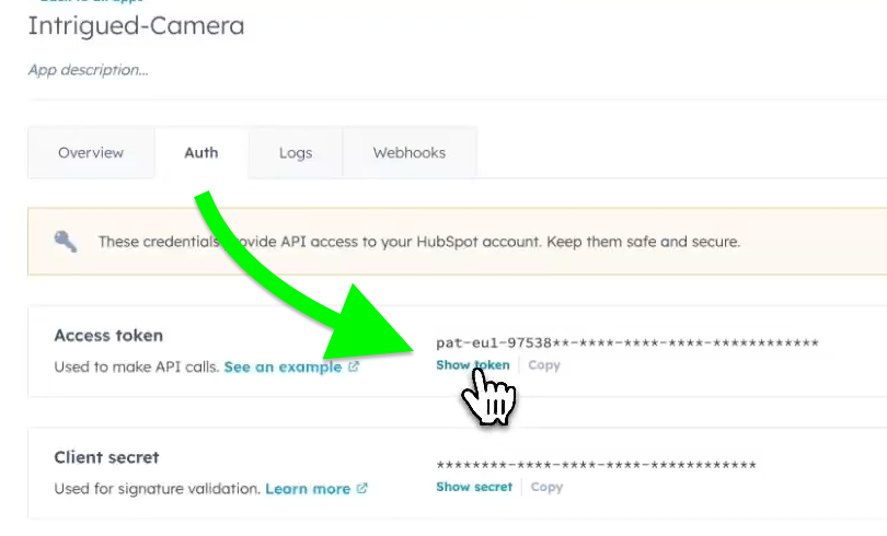 You will now be see your new access token. In the Auth tab of your newly-created app, click the Show token option, which will allow you to copy it: