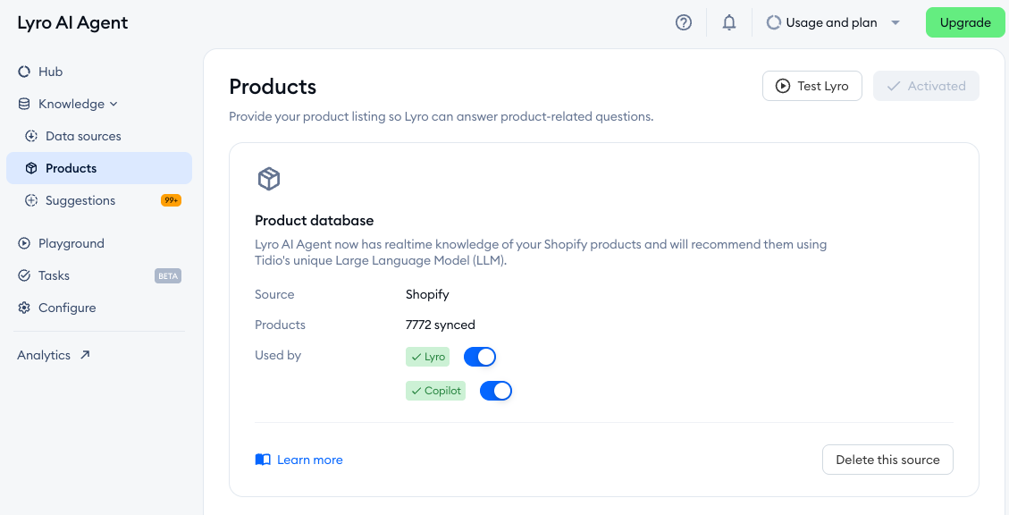 - In the Lyro AI Agent section, go to Knowledge > Products;