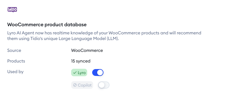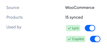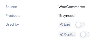 Once you select that option and synchronise your product base, you’ll see the general status of the products imported from your WooCommerce store: the number of products synchronised, as well as the option to disable the feature for Lyro and/or Copilot:
