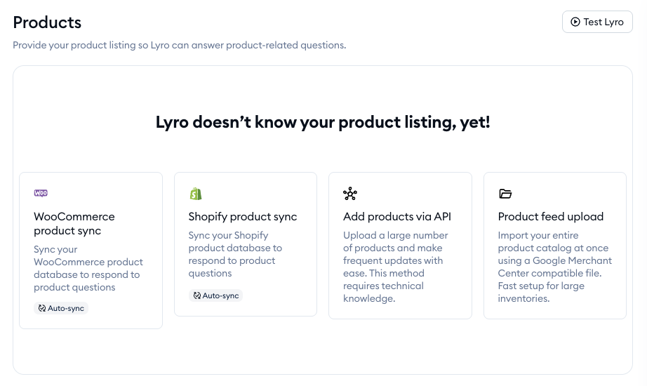 Inside your project's Lyro AI Agent section, go to the Knowledge > Products tab to see the available options. What you're interested in this case is the WooCommerce product sync option: