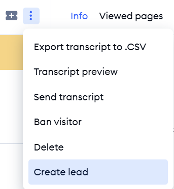 To send a lead - head over to your conversation with the visitor. Click on the three dots menu in the upper-right corner of the conversation panel, then hit the Create lead option. The contact will now be sent to Zendesk Sell.