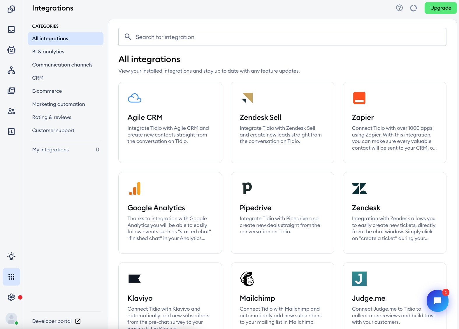 To integrate Tidio with the Zendesk Sell account, open your Tidio admin panel and navigate to the Integration section located in the left sidebar, right above Settings. Then, click on the Zendesk Sell tile.