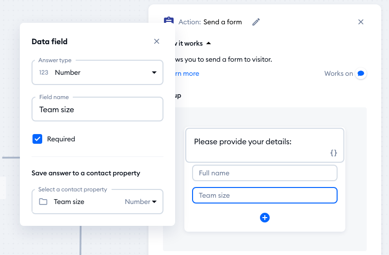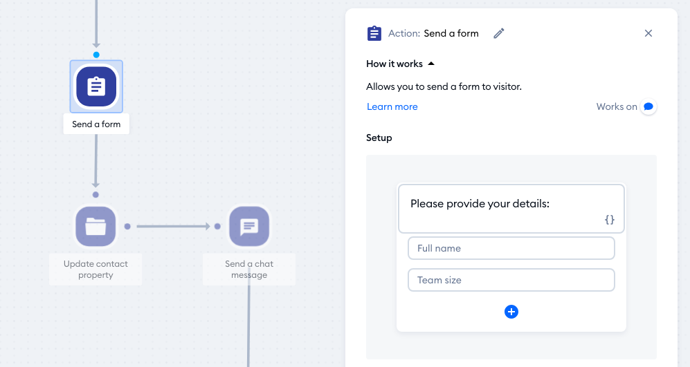 In the example below, the Send a form action asks the visitor for their full name and team size. Asking for these two separate pieces of information is practical and efficient from the customer's perspective, and does not allow much room for error - the two values remain separate, as the Contact Properties 'Name' and 'Team size'.