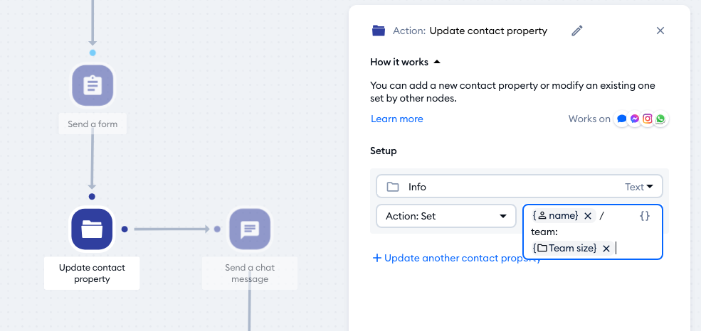 In the example above, the new Contact Property is called 'Info', and the value uses the visitor's two other Contact Properties: 'Name' and 'Team size'. The new value is also formatted for clarity.