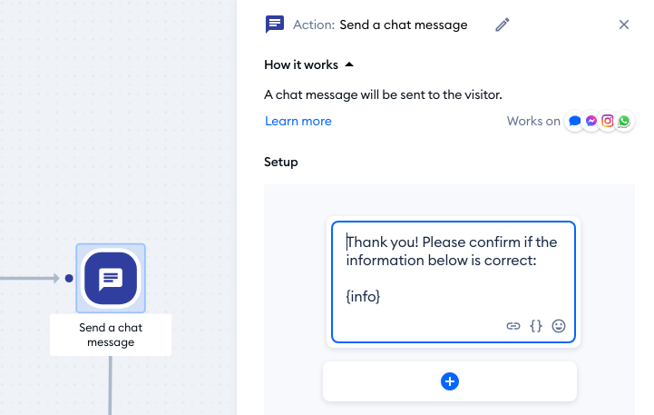 Notice how you can use any existing Contact Property inside your flow messages; simply click on the open braces icon { } to insert a property, or start typing inside an open brace: