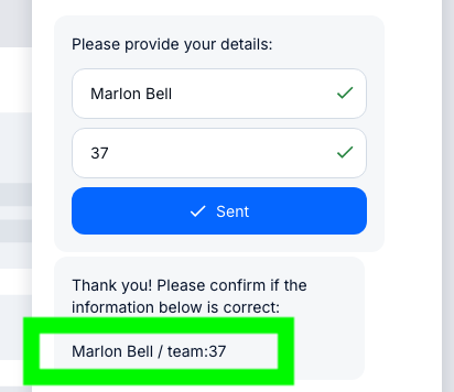 Also in this example, the flow asks the customer to confirm if the info is correct - by displaying the newly crated Contact Property for them on chat: